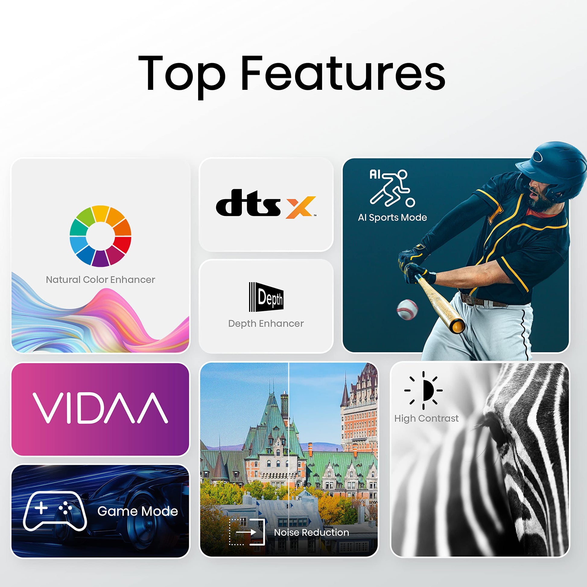 - [AI Sports Mode] AI Sports Mode enables the best picture and audio quality for the smoothest viewing experience. See every crack in the field, the players’ determined stare, and the excitement of everyone in the audience, and hear every note of the commentator's voice. Hisense TVs intuitively sense and clean up and enhance fast-moving objects, for a perfectly fluid viewing experience.
