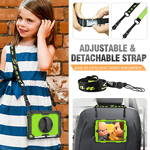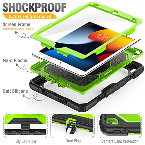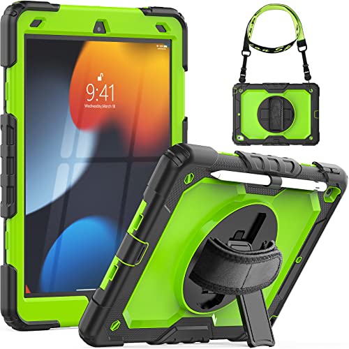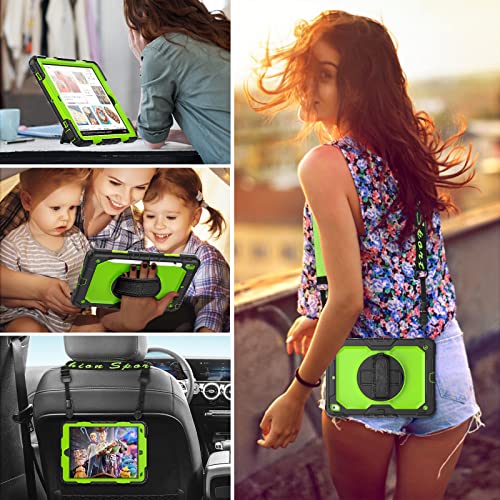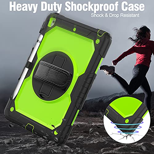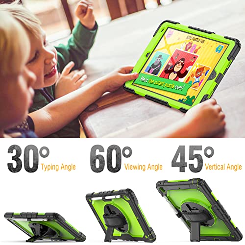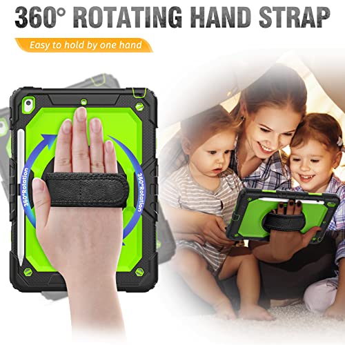 SEYMCY Kids Case for iPad 10.2 inch 9th 8th 7th Generation 2021/2020/2019, Shockproof with [Rotating Hand Strap Stand][Screen Protector][Pencil Holder] Hard Cover for iPad 9th/8th Gen, Black/Green