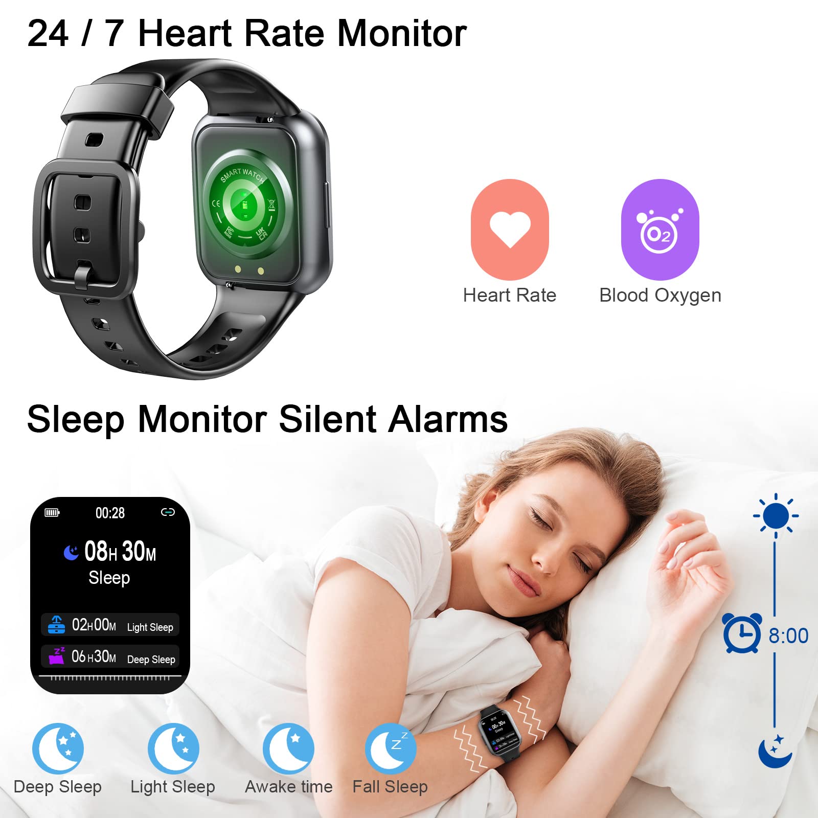 - Comprehensive Health Monitor and More Functions: The smart watch supports heart rate monitor, blood oxygen monitor and sleep monitor. The mens watch includes more practical functions, fitness trackers(Pedometer, Calories, Distance), heart rate monitor, 25 sports modes, sleep tracker, call Notifications, SMS and APP messages, music control, camera control, brightness adjustment, weather display, sedentary reminder, alarm clock, stopwatch, find watch, calculator. It enables you to experience a smarter life.