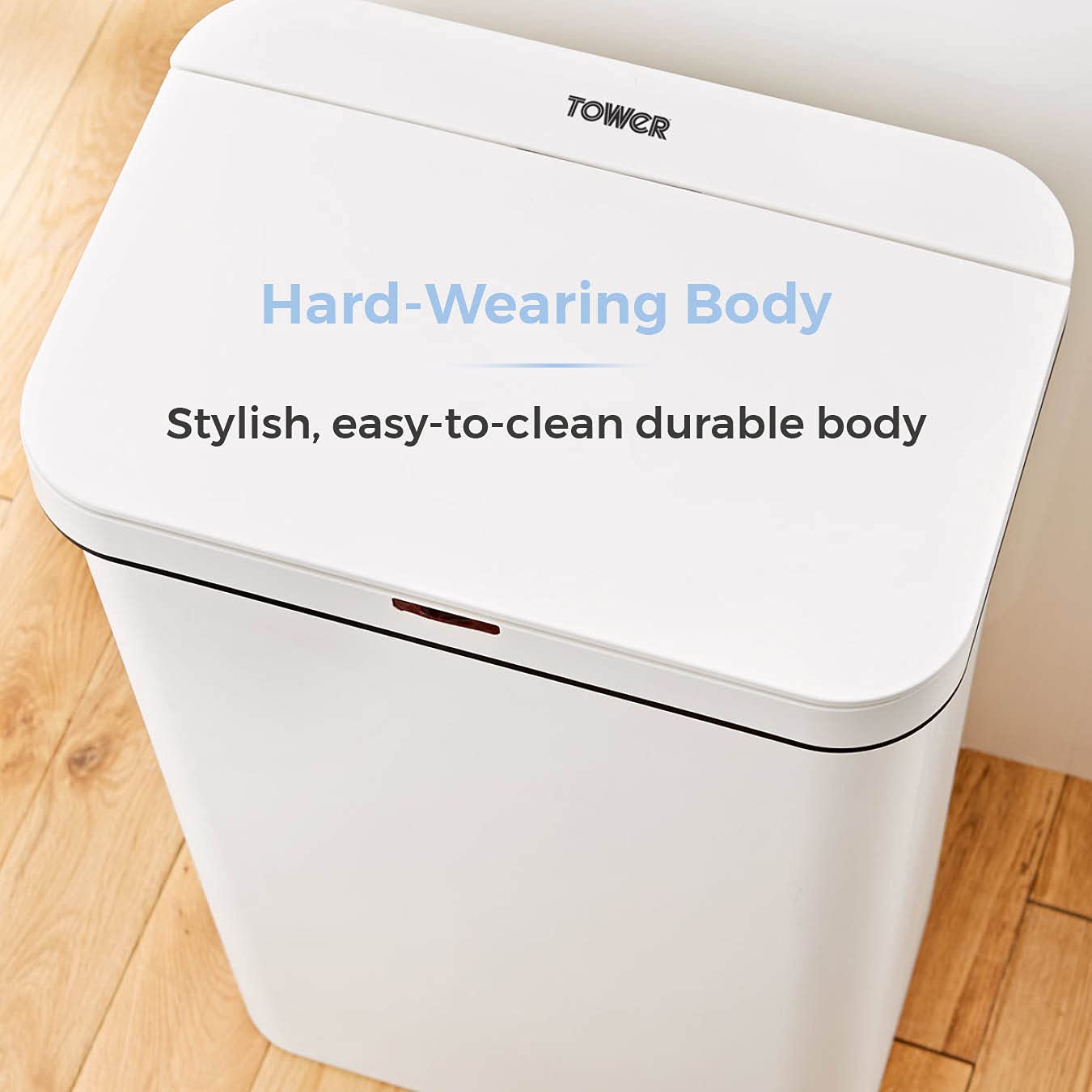 Details: Hygienically dispose of your household waste with this 50L Rectangular Sensor Bin from Tower. It features touch-free opening so you can dispose of household waste hygienically with one swift hand motion. And includes a soft-close function to minimise noise disruption which closes itself after a few seconds of inactivity. Alternatively, there is a power switch if you want to open and close the lid manually. The bin is constructed from a robust yet stylish body that will ensure long-lasting durability.