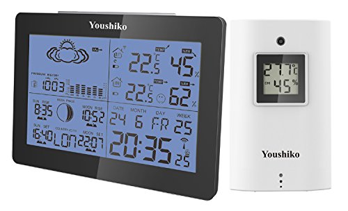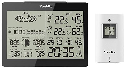 - Sunrise / Sunset / Moonrise/ Moonset times with graphical moon phase display and Barometric pressure, If you need help setting up this device, get in touch with Youshiko customer services, Also please note: Once to set up this weather station, it does take time for temperature / Humidity to settle down, so please allow at least 6 hours and Indoor display unit must be placed inside some where out of direct light, otherwise you may not see screen clearly.